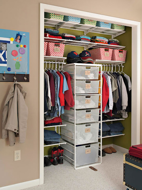 Organize your own closet or a child's with a combination of double-hanging rods, drawers, and shelves. Drawers corral small items such as socks while cubbies hold folded items. Upper shelves can store out of season shoes and clothing in clear bins with lids.